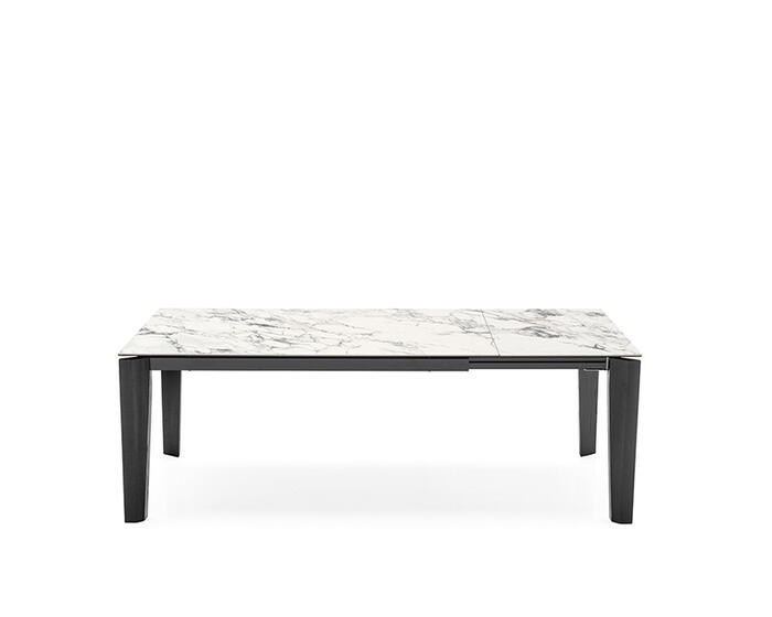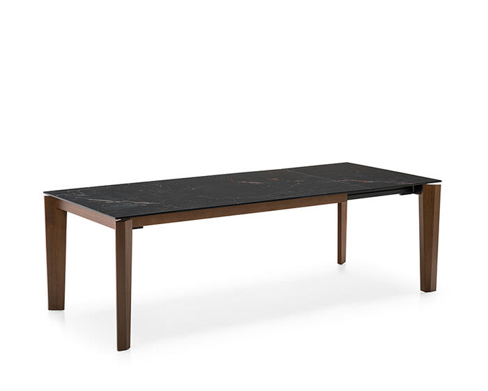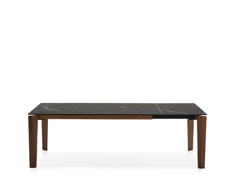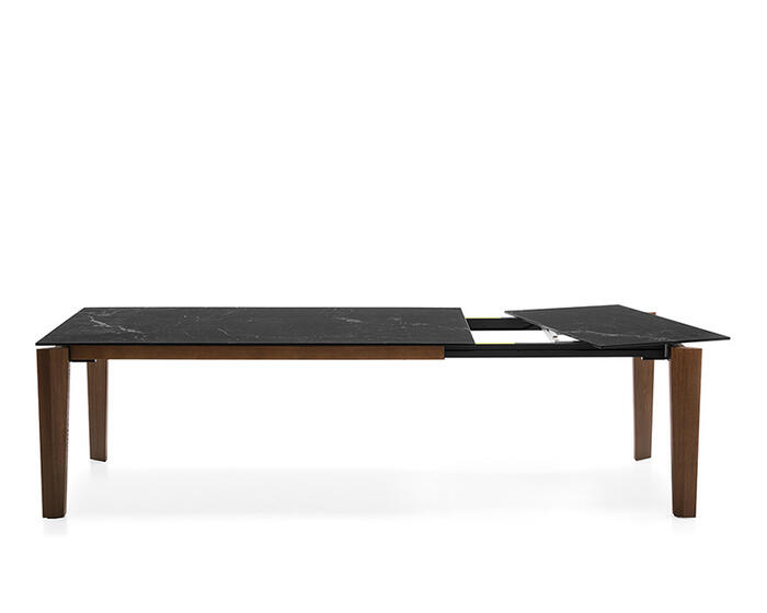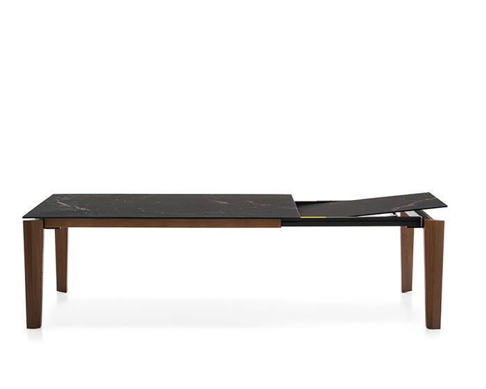 <p>Its design flexibility arises from the combination of wooden legs and a selection of various ceramic tabletop options. Additionally, the subtly tapered and multi-faceted outer legs ensure the highest level of comfort for seated guests, while the extensions are seamlessly integrated into a guided opening frame.</p>