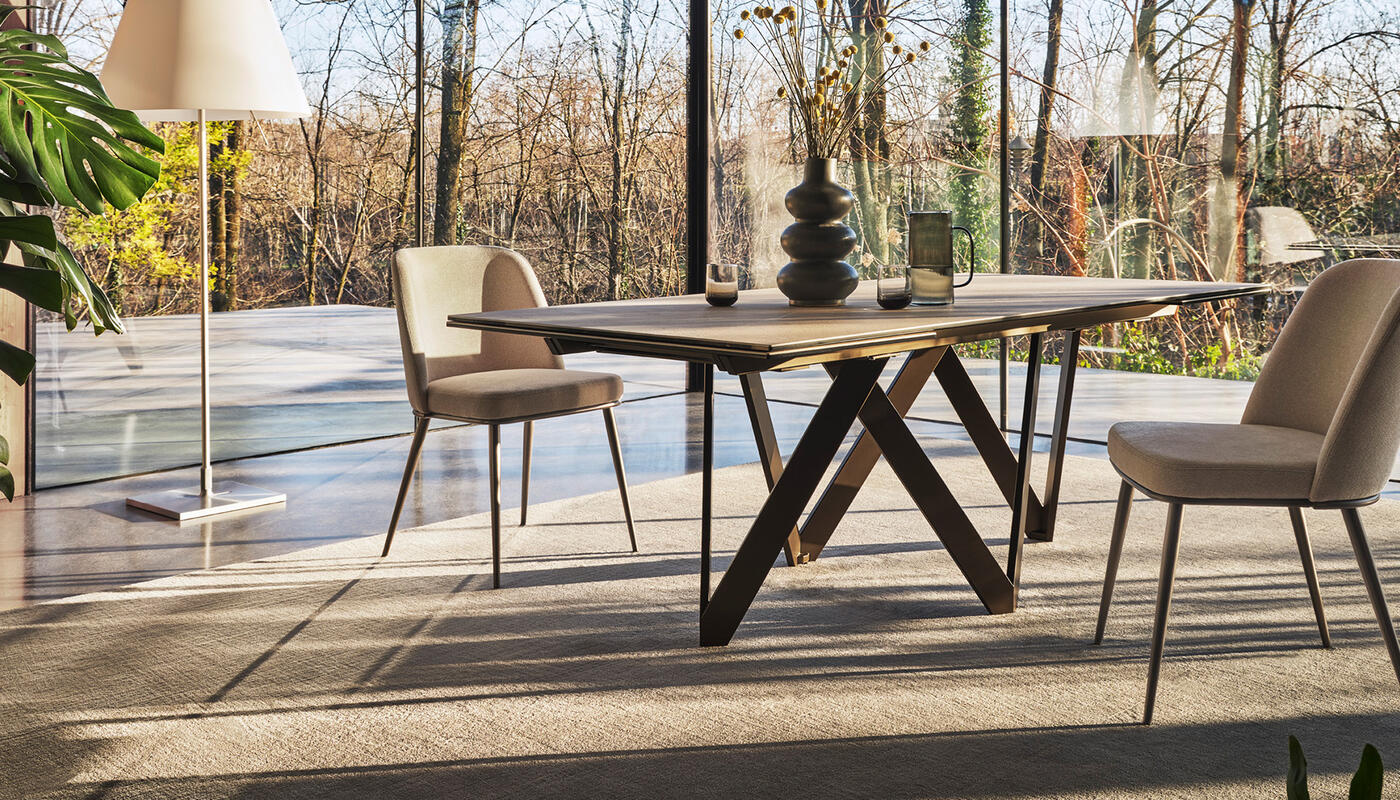 The CARTESIO extendable table showcases timeless elegance with its iconic design, offering a range of ceramic tabletop options supported by a unique, coated metal frame. This frame is constructed from four independent rectangular "V" elements.