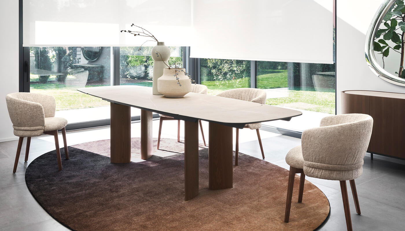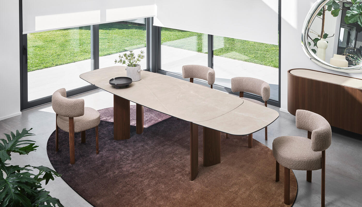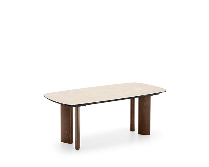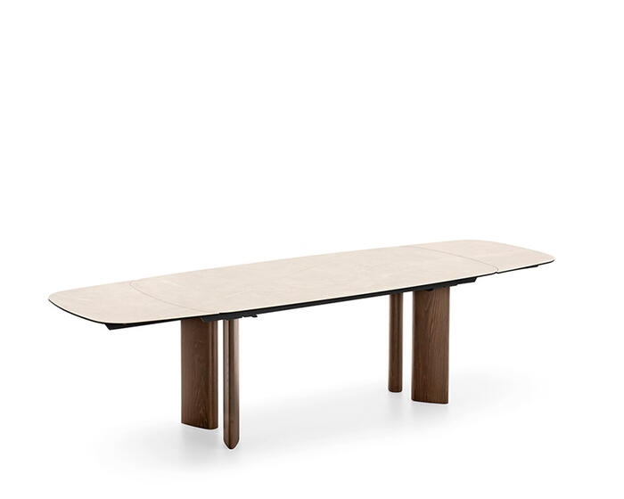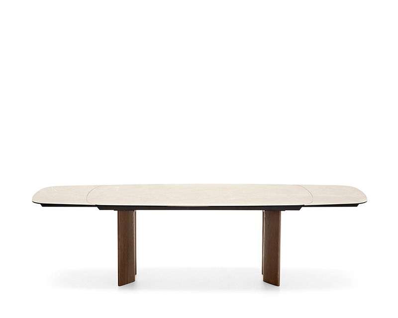 Sandy is a collection of tables that feature a teardrop leg, a cross-section with a sophisticated design that can accommodate different table top geometries – rectangular, round or oval, both fixed and extendable.