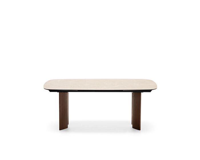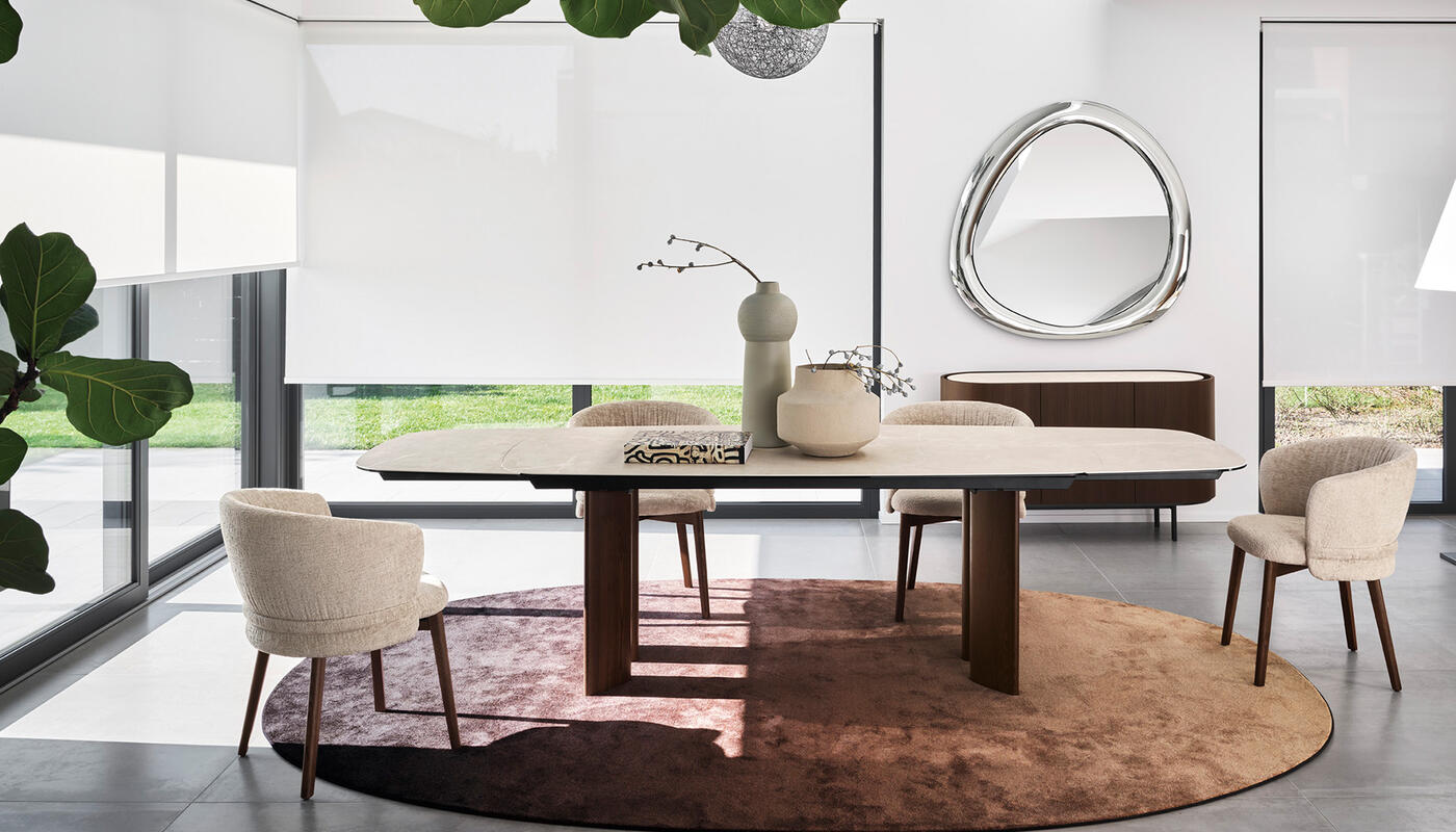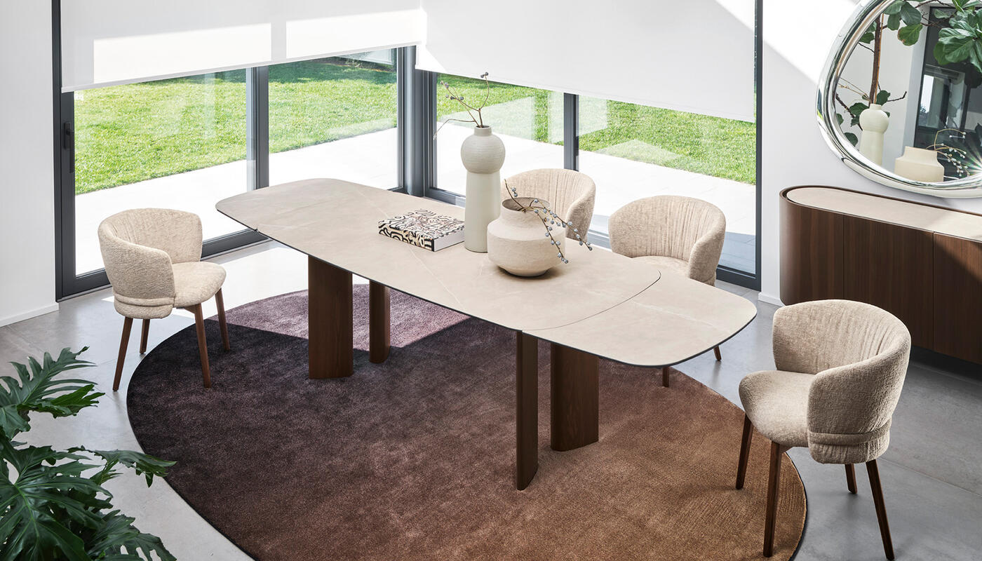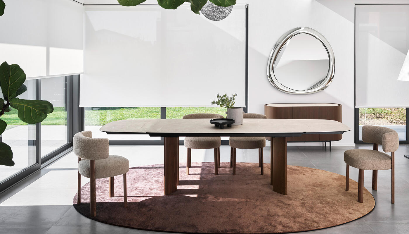 Sandy is a collection of tables that feature a teardrop leg, a cross-section with a sophisticated design that can accommodate different table top geometries – rectangular, round or oval, both fixed and extendable.