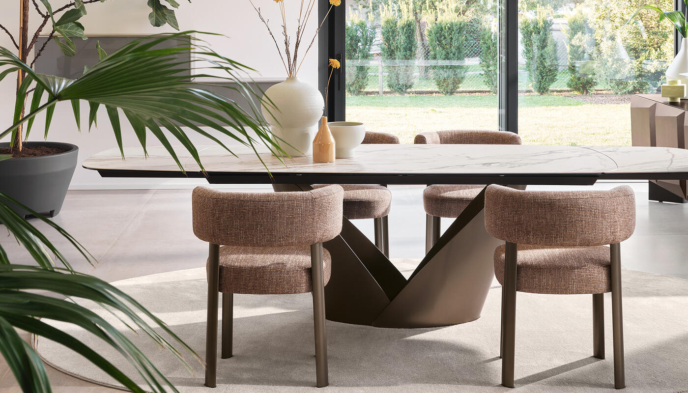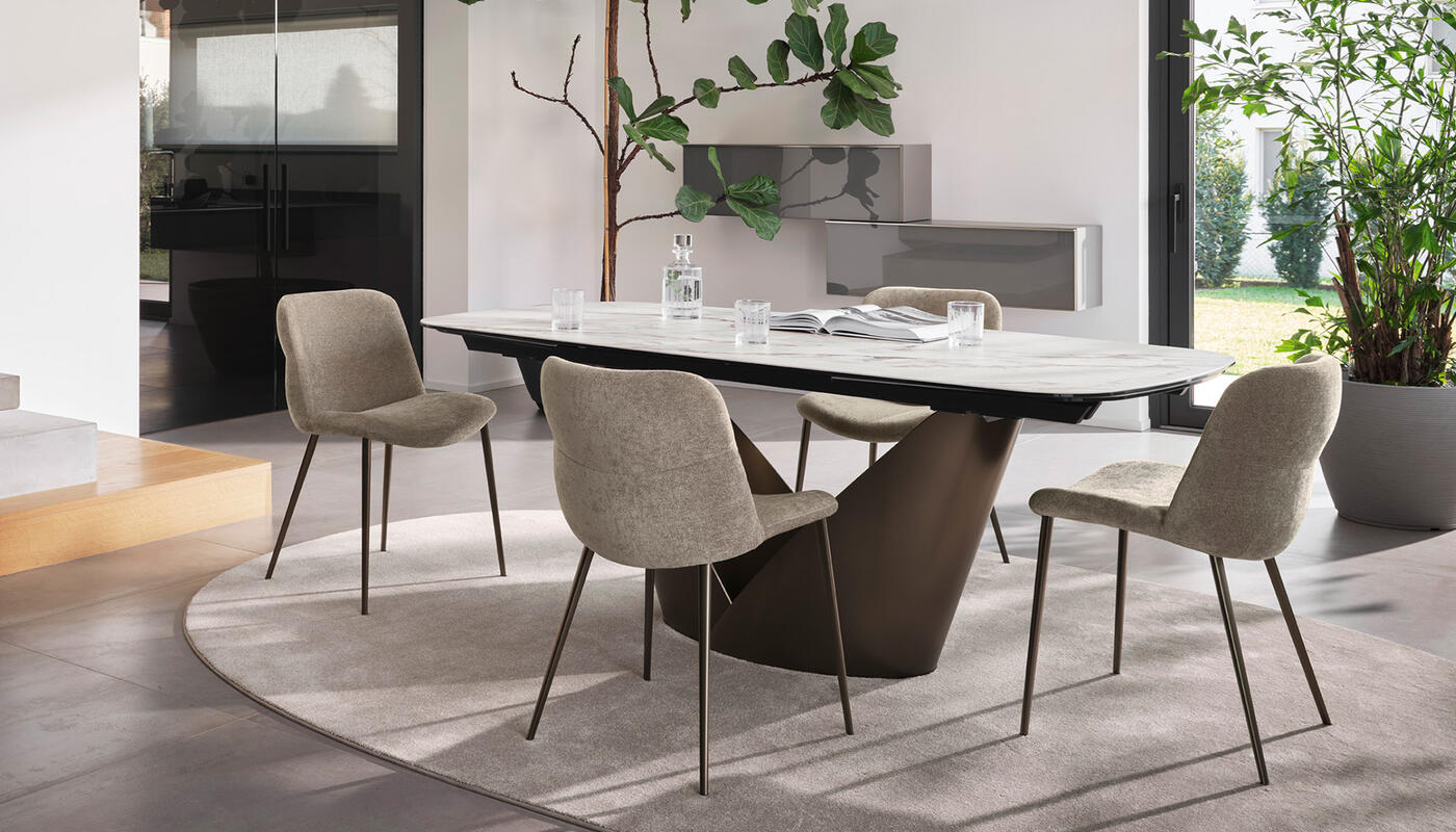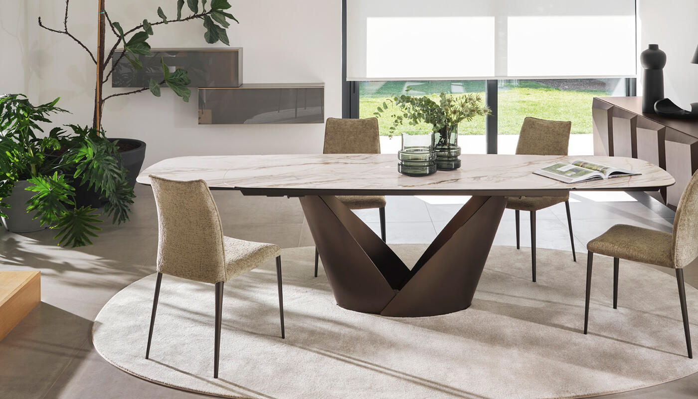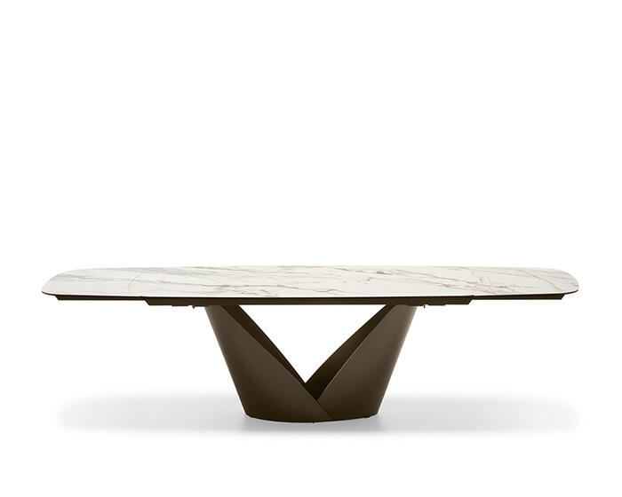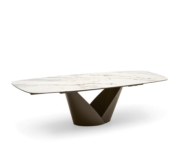 A prominent table, designed to be the centrepiece in the contemporary living space. Calla features a base that resembles a flower – robust yet light, it consists of two metal blades which, as petals do, interlock, creating a chalice shape that opens out upwards, alluding to vitality and rebirth.