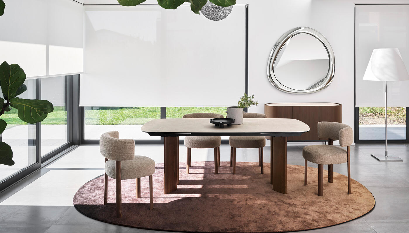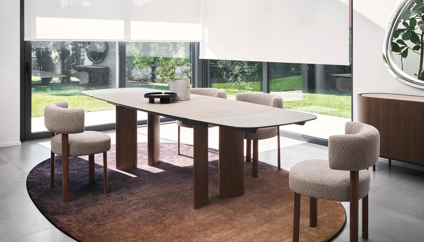 Sandy is a collection of tables that feature a teardrop leg, a cross-section with a sophisticated design that can accommodate different table top geometries – rectangular, round or oval, both fixed and extendable.