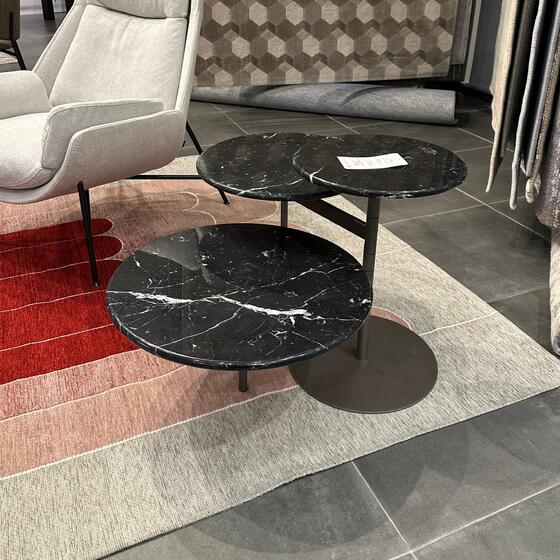 Black Marquina Marble top / Light Brown Metal Base. Features 3 rotating arm to allow for different configurations W34-48" D23-30" H22" -----On Display in Tysons