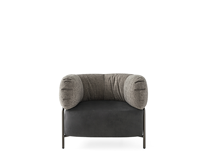 Quadrotta brings together the reassuring comfort of a classic armchair with a distinctly contemporary sensibility. Defined by a soft, enveloping backrest and a tall, generously padded seat, its design plays on subtle contrasts—smooth and plush, minimal and expressive. The metal frame, which follows the natural curve of the seat and backrest, adds a precise architectural note.
