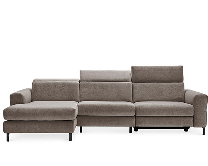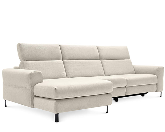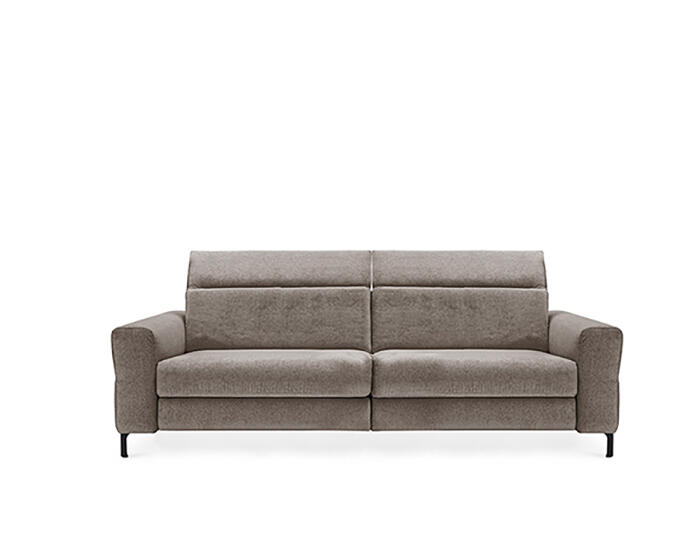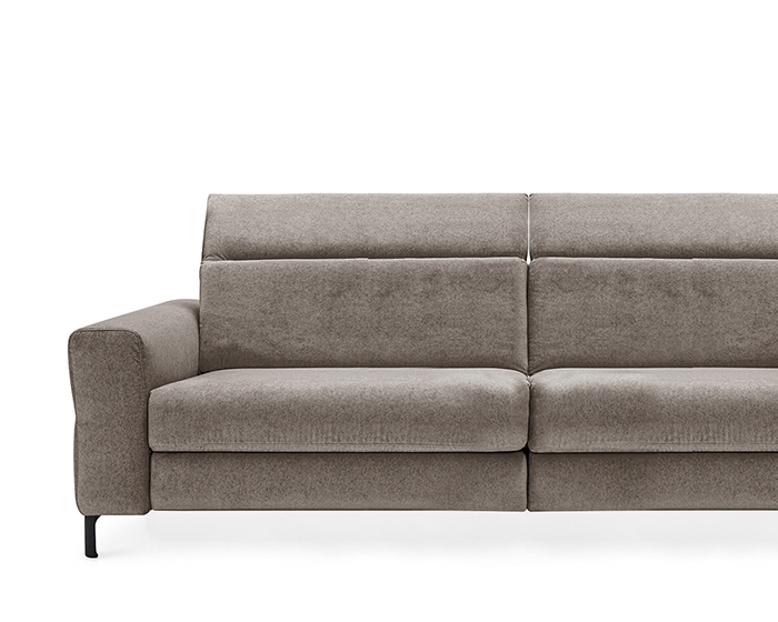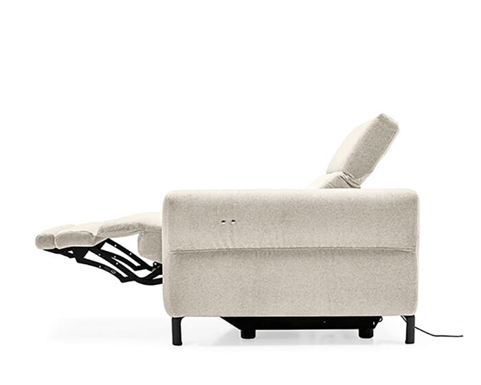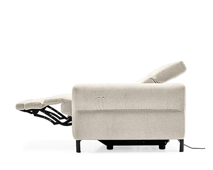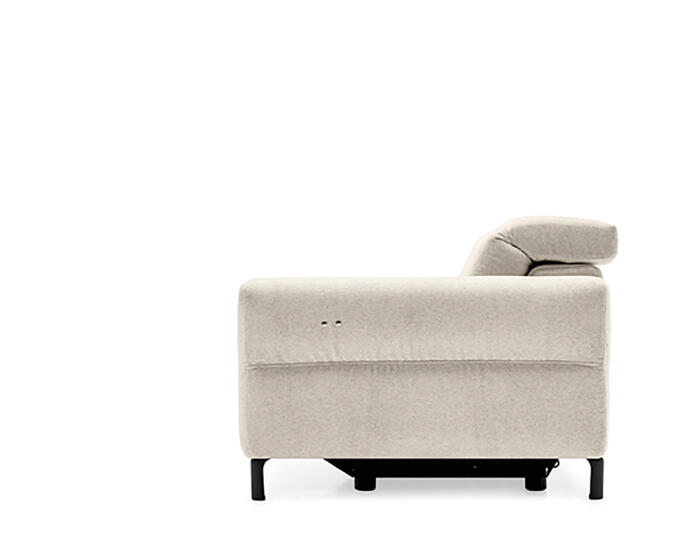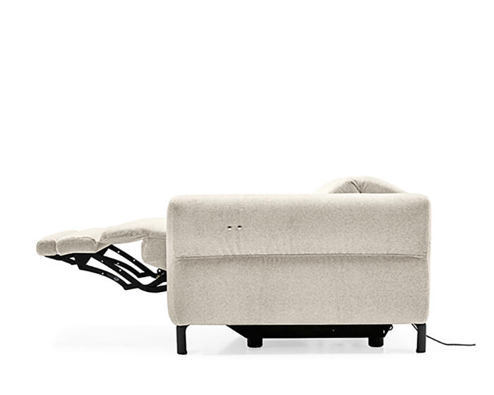 Norma is a sofa where traditional lines quietly give way to advanced comfort. Beneath its composed exterior lie two integrated mechanisms designed to support relaxation: a manually reclining backrest and an electric footrest that extends smoothly at the touch of discreet buttons built into the armrest.