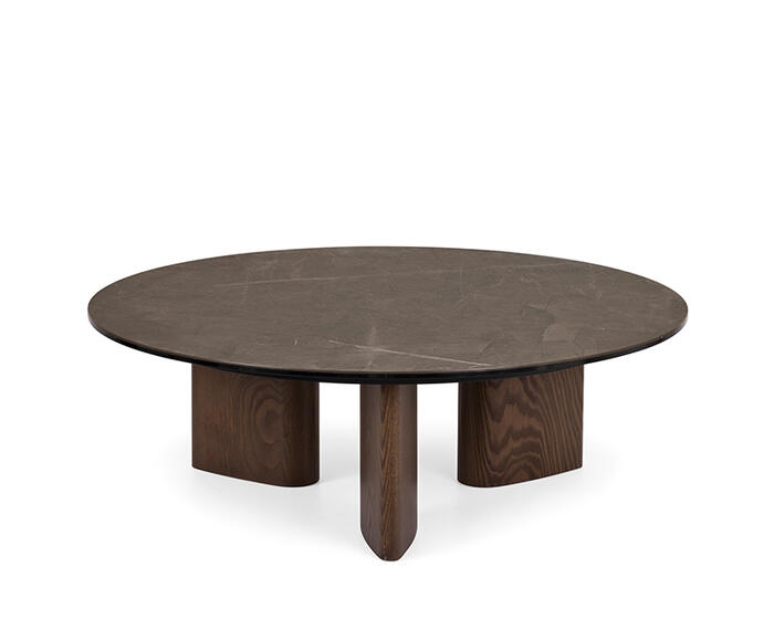 The Sandy large round coffee table is part of an extensive collection that includes coffee tables and a console table, all unified by the distinctive teardrop-shaped leg. Its sloping cross-section creates a striking three-dimensional effect, giving the base a sculptural quality that remains consistent across the range.