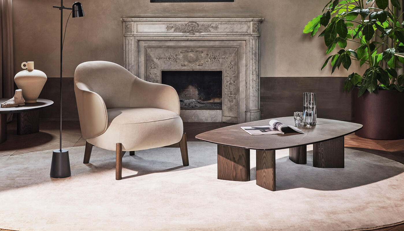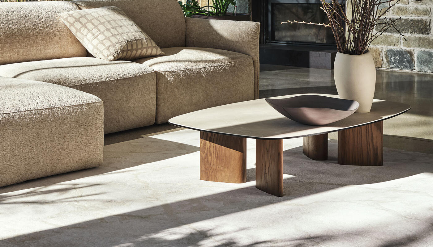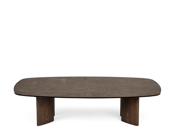 In this larger coffee table version, the elliptical top is supported with balance and visual continuity, expressing the same design language found across the Sandy family—from classic coffee tables to console tables with two legs and smaller side tables with a central pillar. The result is a coherent form that feels both expressive and grounded within the living space.
