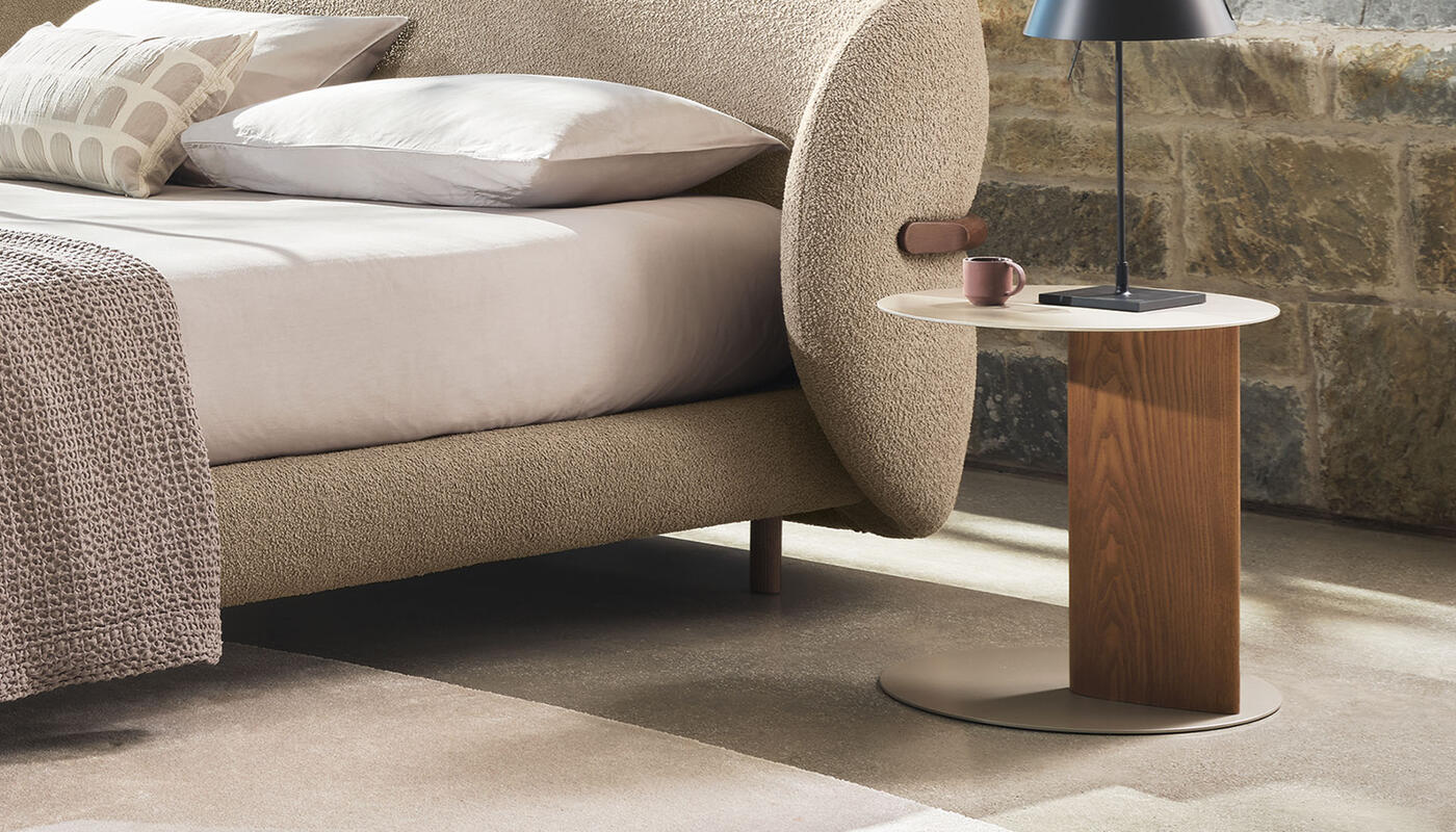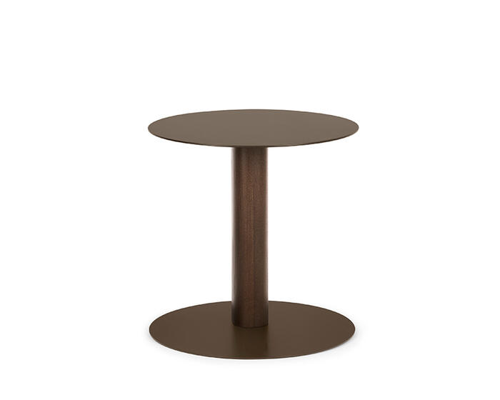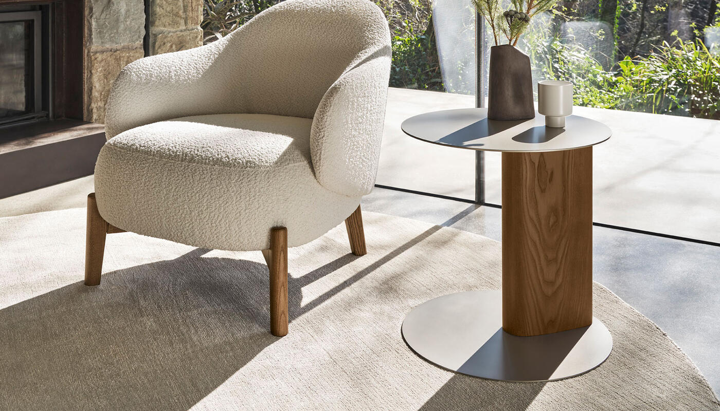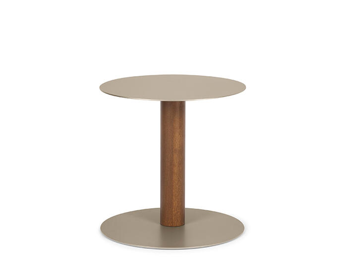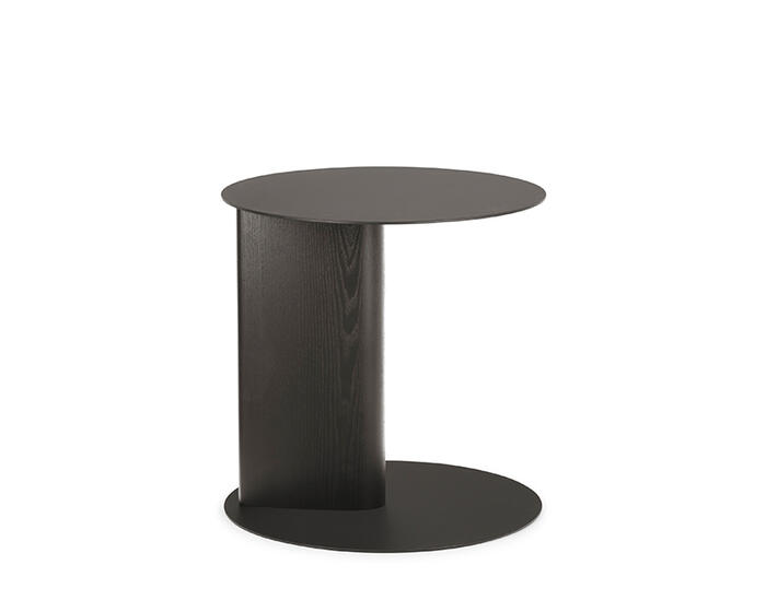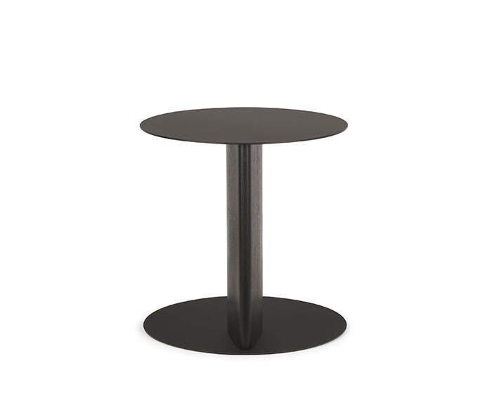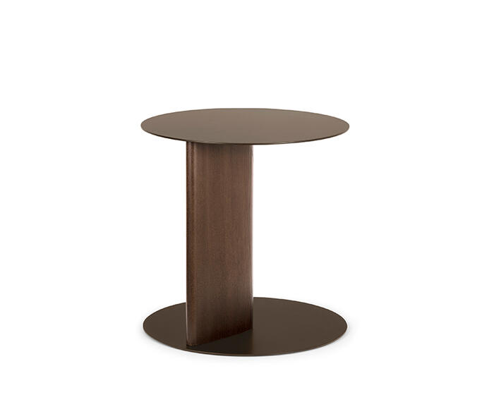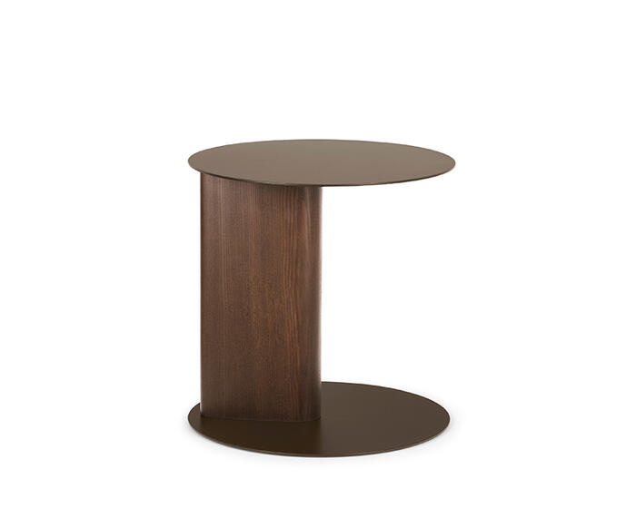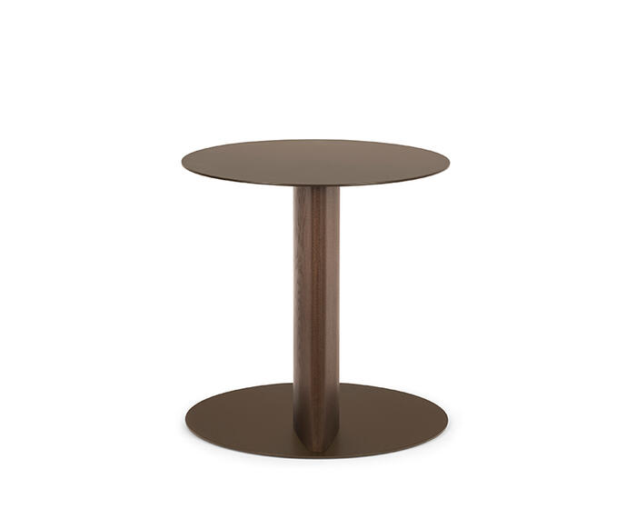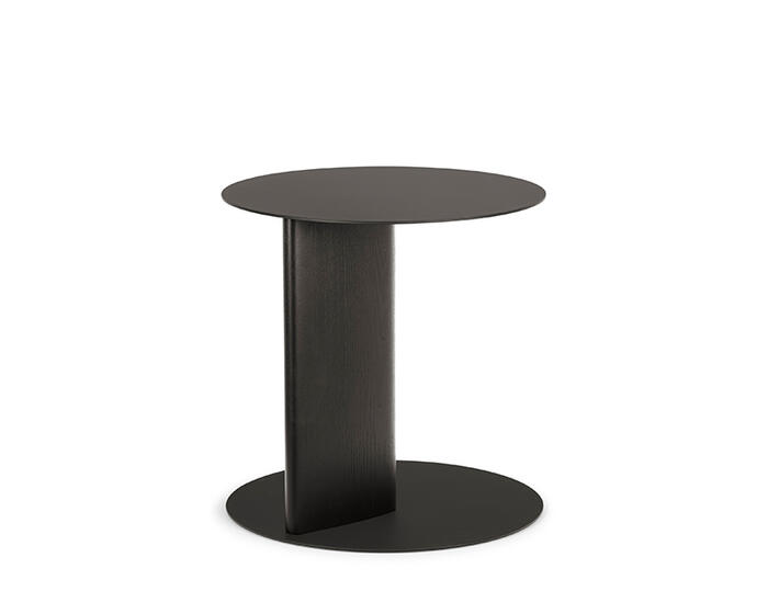The Sandy side table with wooden pillar base is part of an extensive family that includes coffee tables and a console table, all defined by the collection’s distinctive teardrop-shaped leg. In this version, the sloping cross-section is translated into a central pillar, giving the base a strong three-dimensional presence.