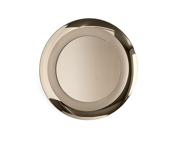 A curved frame defines the mirror, finished with reflective glass on the outer edge and a satin-finished inner surface that introduces contrast and depth. Available in grey or bronze mirror finishes, Surface offers a versatile solution for living areas, bedrooms, and hallways.