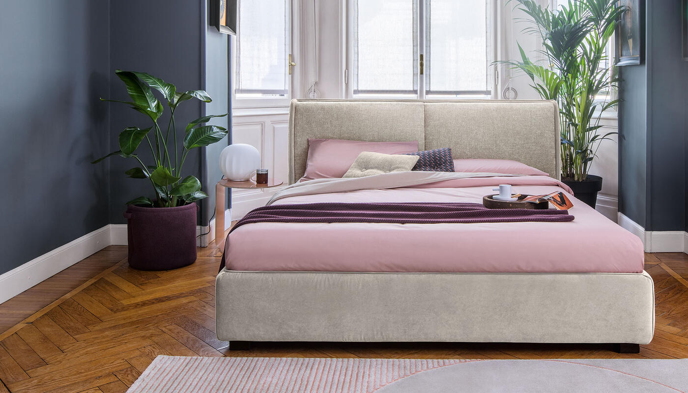 Dolly reinterprets the headboard as an embracing architectural element. Its distinctive shell rises from the base and wraps around two soft cushions, which can be upholstered in matching or contrasting materials to create subtle two-tone or two-material compositions. The result is a bed that feels both protective and expressive, balancing softness with structure.