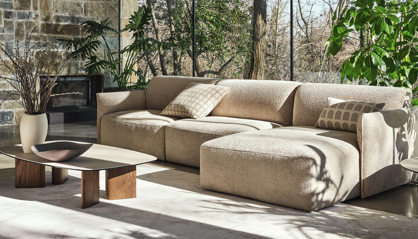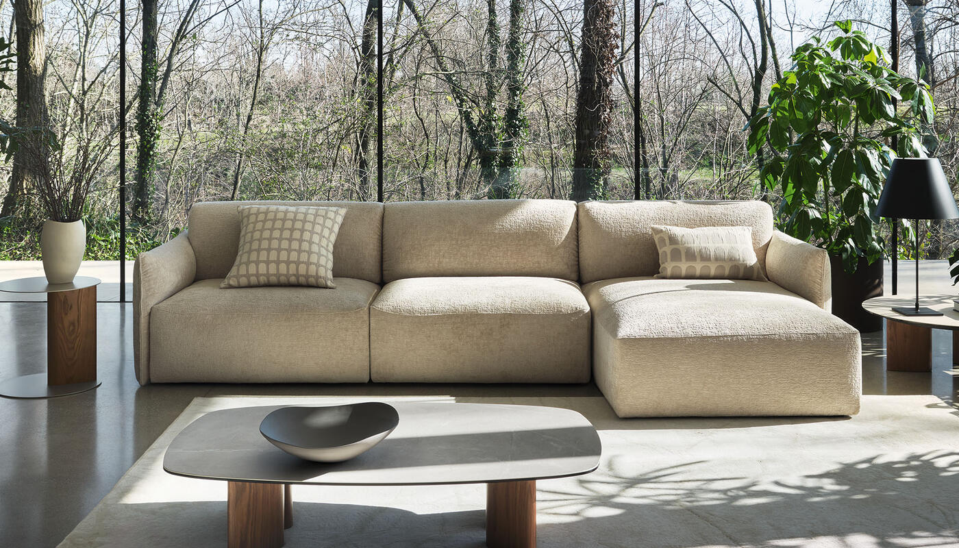 Axis Low is a sofa system designed to adapt with ease. A collection of upholstered elements allows for tailored compositions that respond to both space and personal comfort preferences. Linear arrangements can be extended with an end chaise longue, while the distinctive sloping component introduces a contemporary note to an otherwise classic, balanced design.